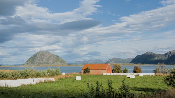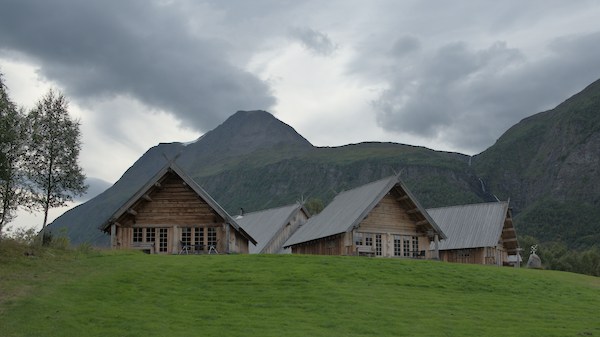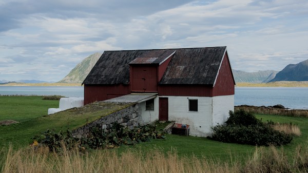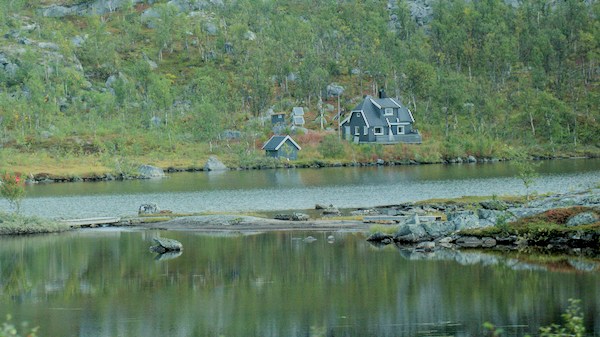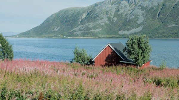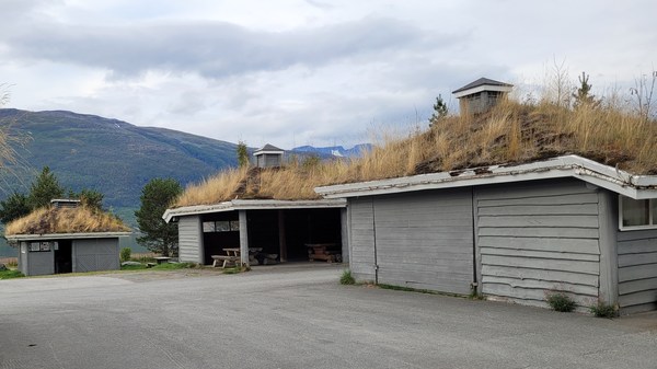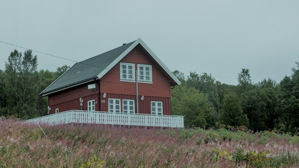 Organisation typique d’une maison en Norvège : le garage séparé de la maison, un sauna lui aussi séparé et une pelouse magnifique tondue par un robot.