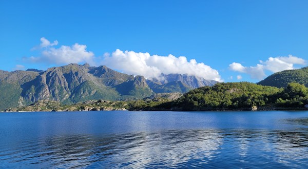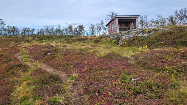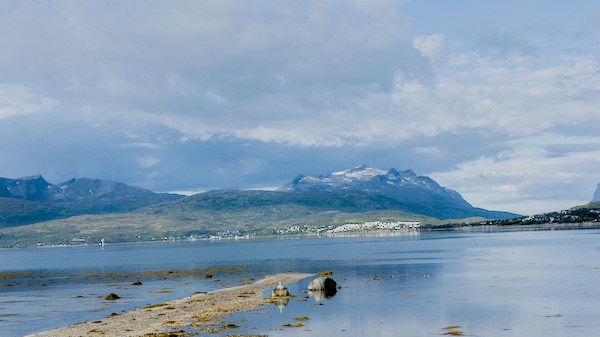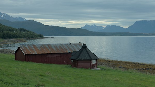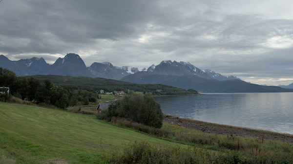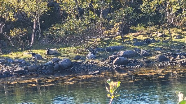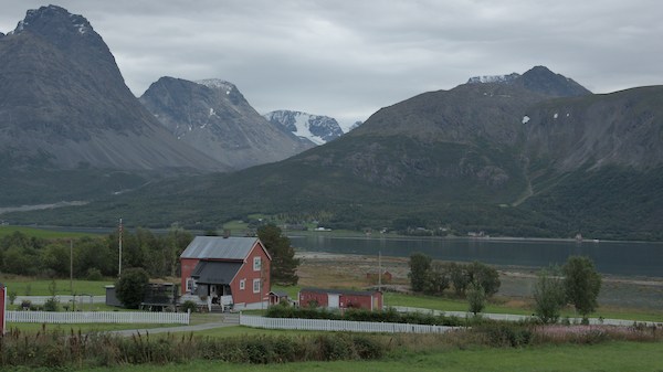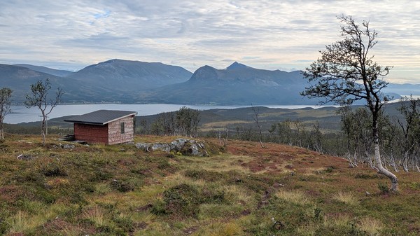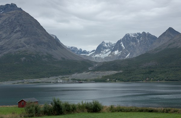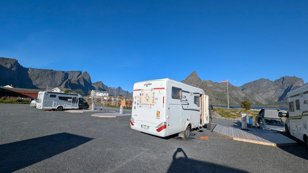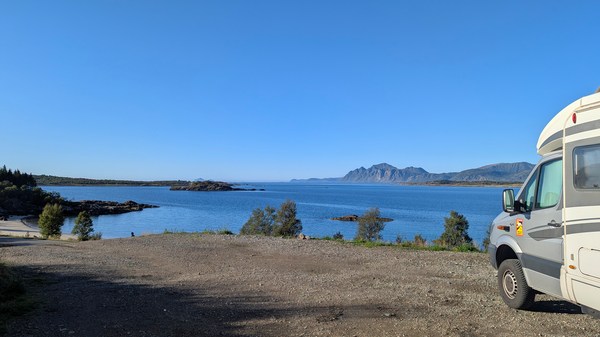 Cette après-midi, nous sommes dans un très beau coin nature devant un fjord des Alpes de Lyngen avec WC chauffés, douches, abri feu, tables de pique .