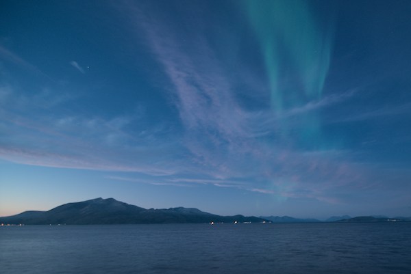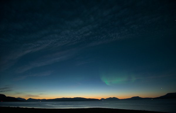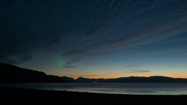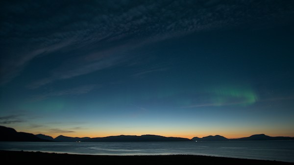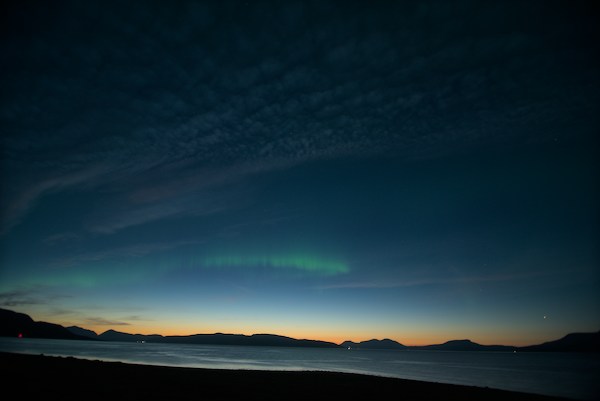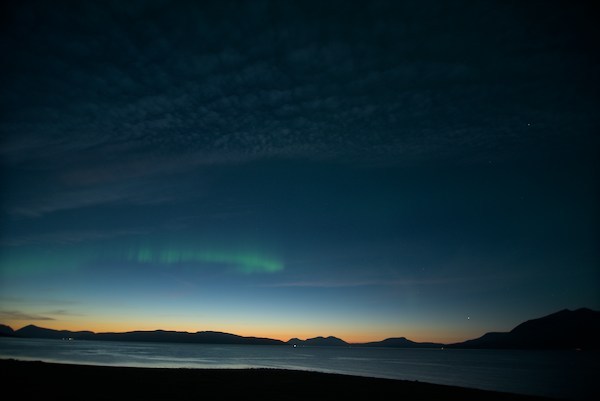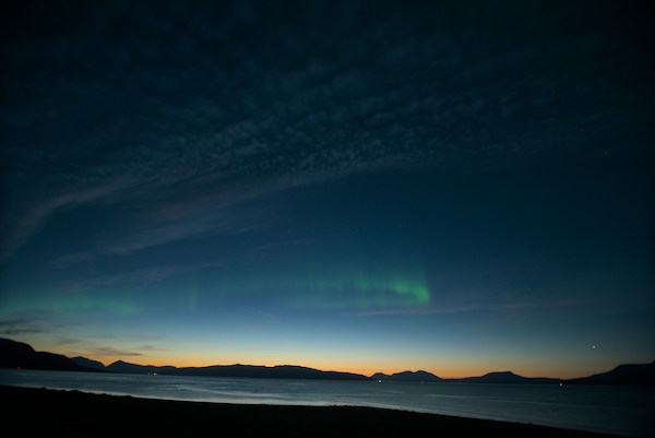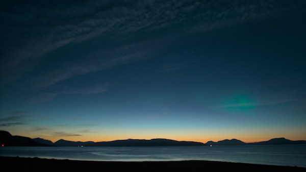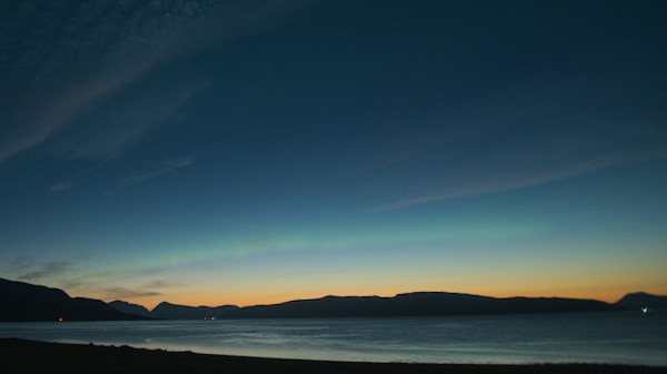 Journée tranquille, nous sommes restés au même endroit, aux premières loges pour le spectacle en espérant qu’il ne soit pas annulé. Super emplacement au 70eme parallèle, vue dégagée à 180 degrés sur le Grunnfjord, pas de nuages pour le moment, KP à 5, donc tous les ingrédients sont là et les espoirs sont permis.
