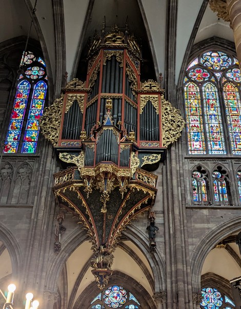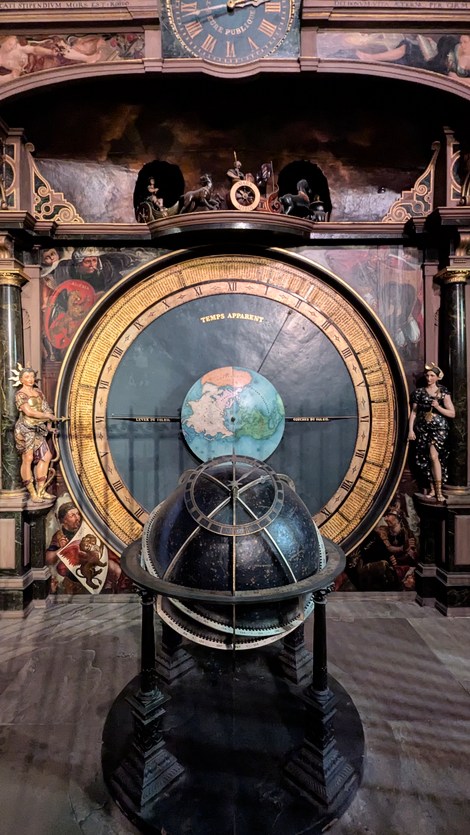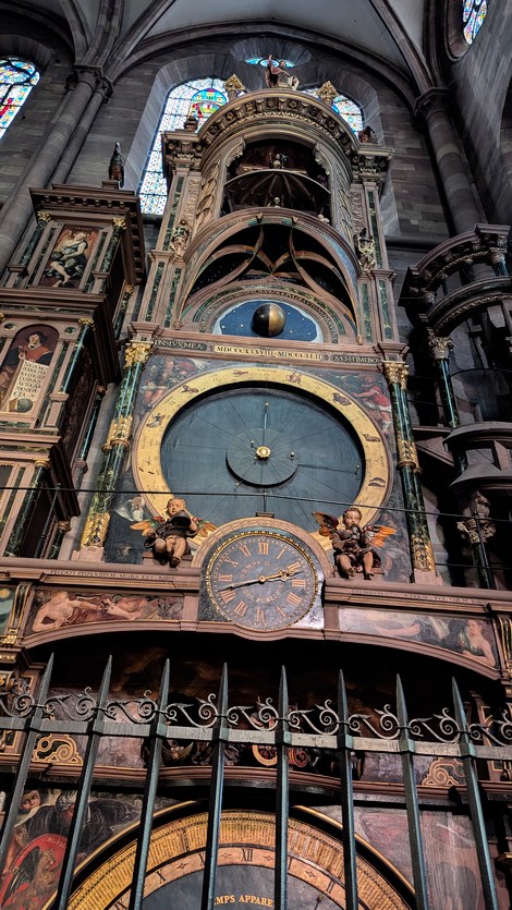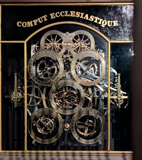 Le mécanisme actuel est l’œuvre de Jean-Baptiste Schwilgué, conçu de 1838 à 1842. Elle indique le temps, les phases lunaires, la position des planètes et présente un défilé d’automates tous les jours à 12h30.